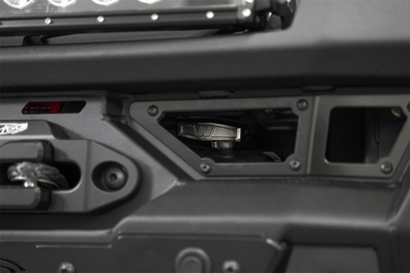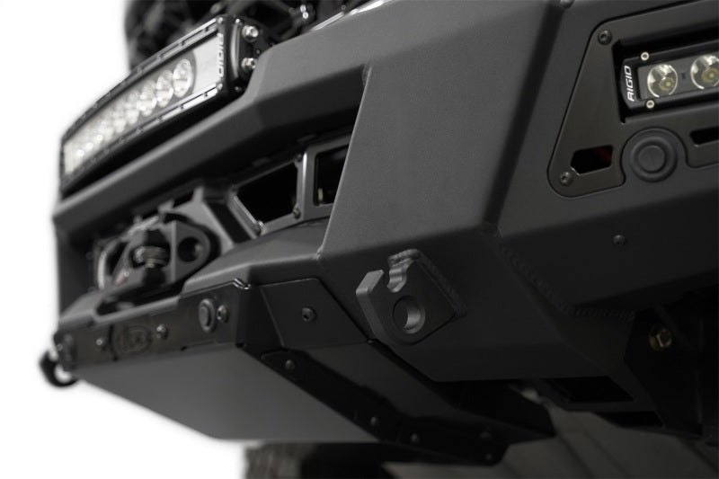 Our Phantom Front Bumper provides a precise and seamless fitment that elevates the exterior styling of your truck. Supplemental lighting is provided by a center recessed light pocket that accommodates a 20-inch light bar or individual pod lights; and a pair of side 10-inch light bar mounts. The integrated standard heavy-duty winch mount and two 1-inch thick D-ring mounts provide full vehicle recovery capabilities. Made from American steel, our Phantom Front Bumper offers unmatched protection from hazards encountered on and off the road. The bumper is finished in a dual-stage hammer black powder coat for a sleek and aggressive design. The included durable 3/16-inch aluminum skid plate guards the front undercarriage of your truck from debris and other obstacles. The bumper retains all of the OEM parking sensors. All ADD products are proudly made in the USA.